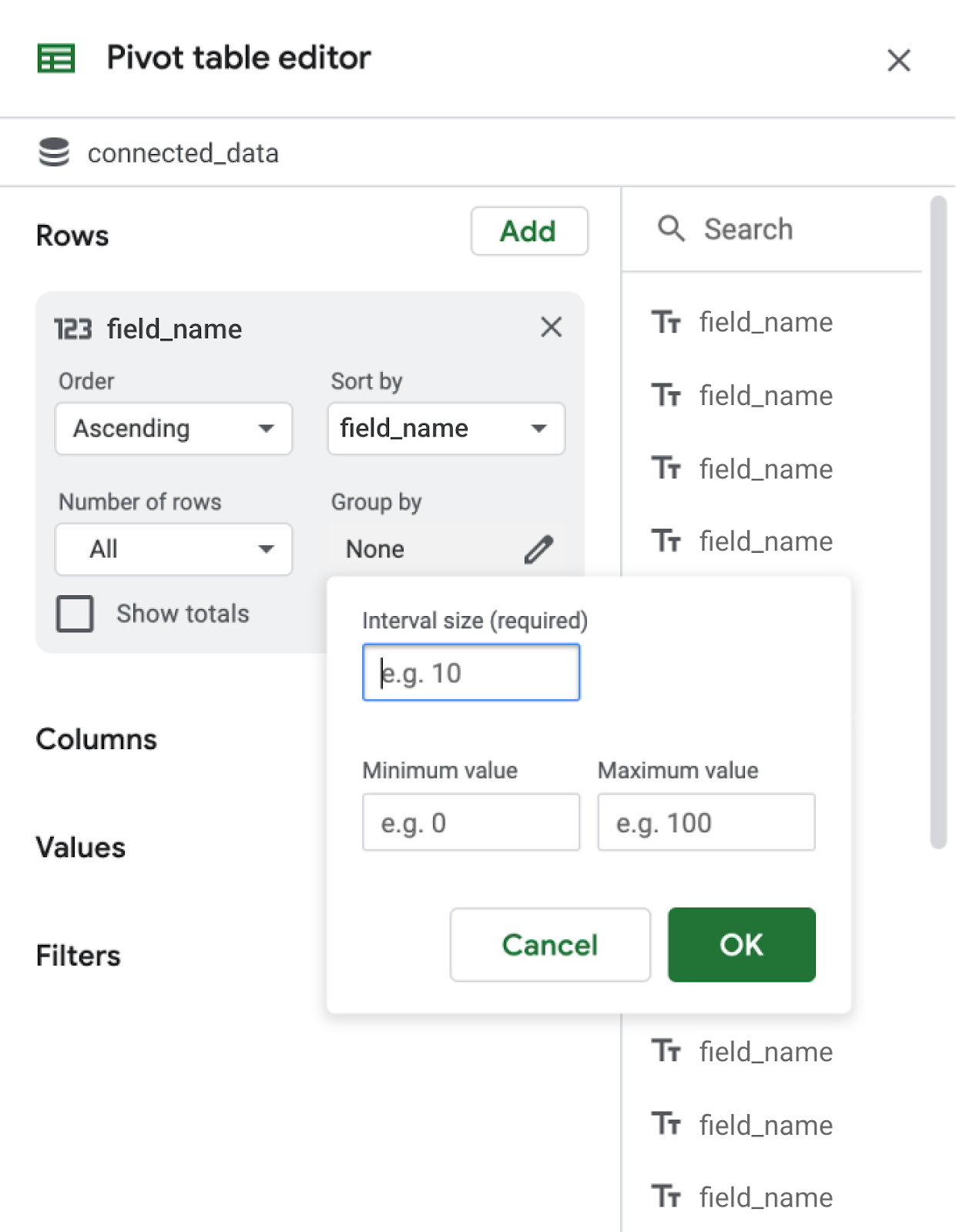 Ahora puedes agrupar los valores numéricos de tus datos de origen en intervalos de igual tamaño en las tablas dinámicas de Hojas conectadas. Esta función te resultará útil cuando trabajes en una tabla dinámica con muchos valores únicos, ya que las agrupaciones permiten acotar tus datos según intervalos y valores mínimos y máximos. Entra en el Centro de ayuda de Google para obtener más información sobre cómo agrupar datos en las tablas dinámicas de Hojas de cálculo de Google.