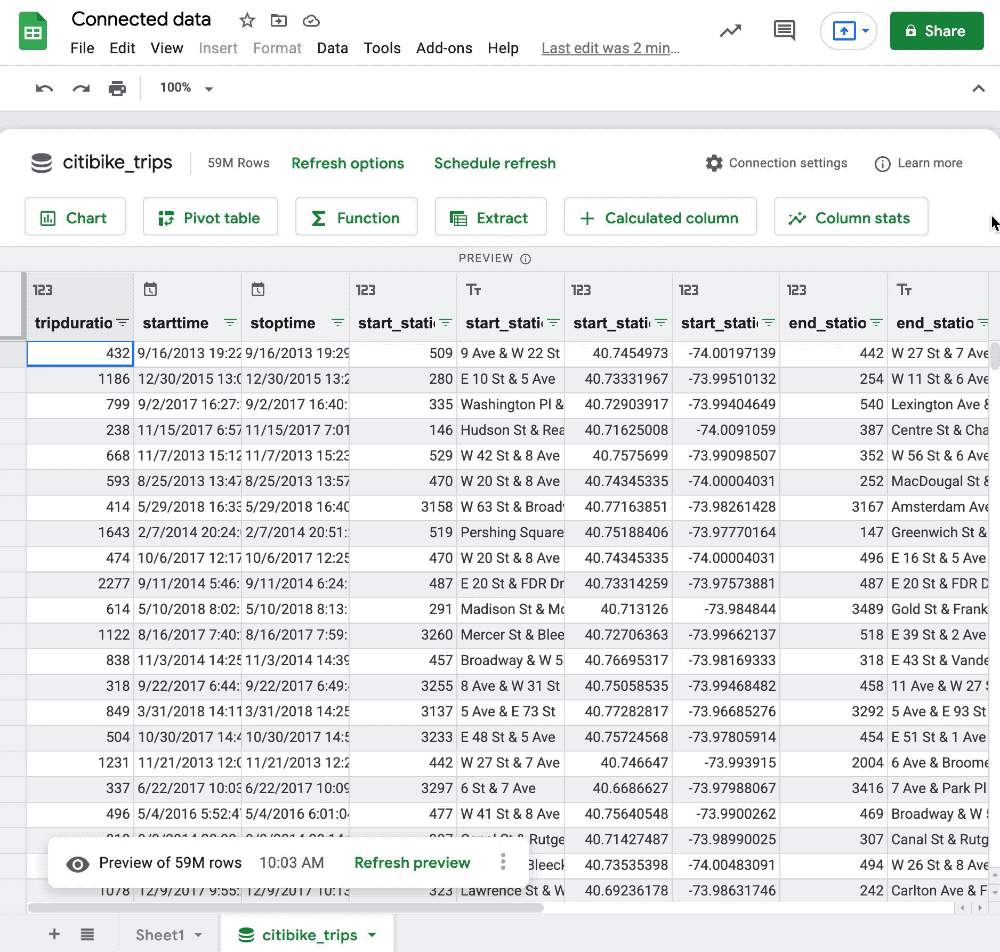Google agregó varias funciones que te brindarán nuevas formas de trabajar con tus datos de BigQuery, mostrarlos y organizarlos mediante Hojas conectadas. En particular, las nuevas funciones y mejoras son las siguientes: